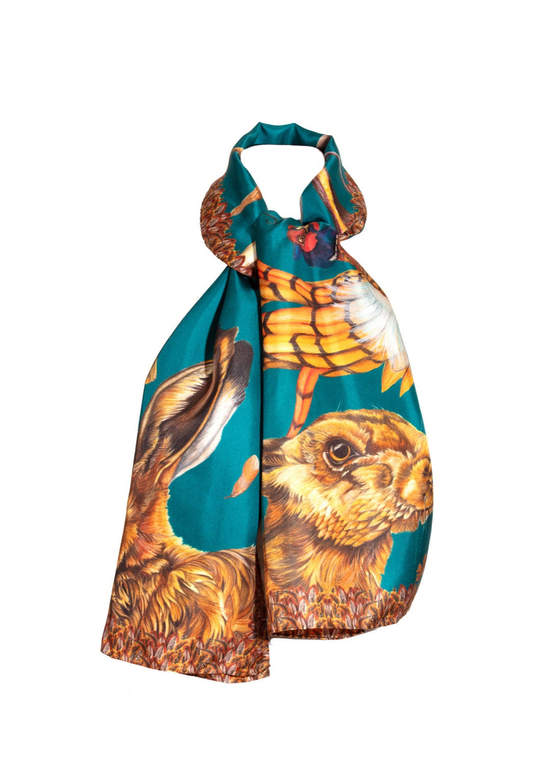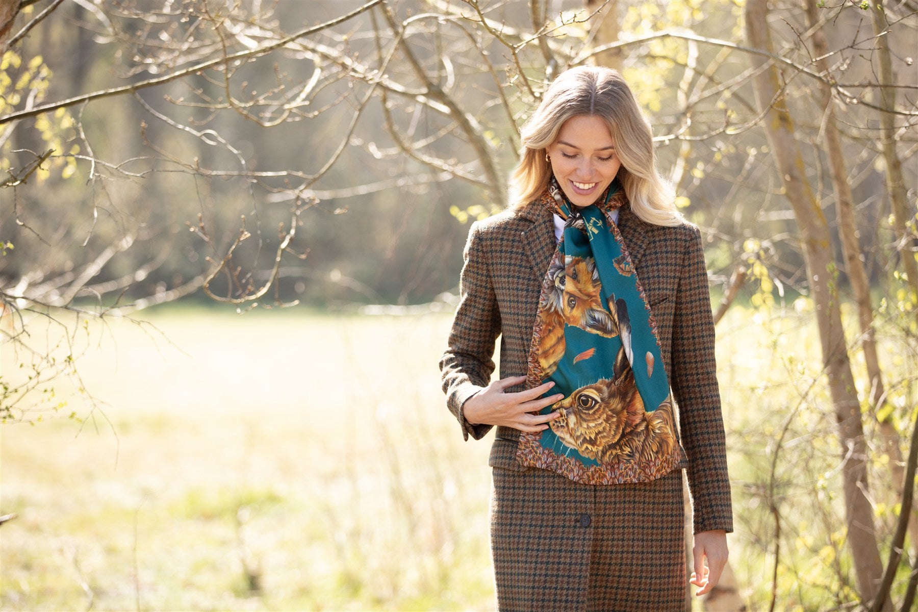 Pheasants, grey and French partridges, the majestic stag (“Caledonia”), hare, snipe, and feather accents all intermingle in this joyous collection. With a striking Teal colourway now available in our luxurious Classic Pure Silk Scarf, there's no better way to wrap yourself in Autumnal hues.