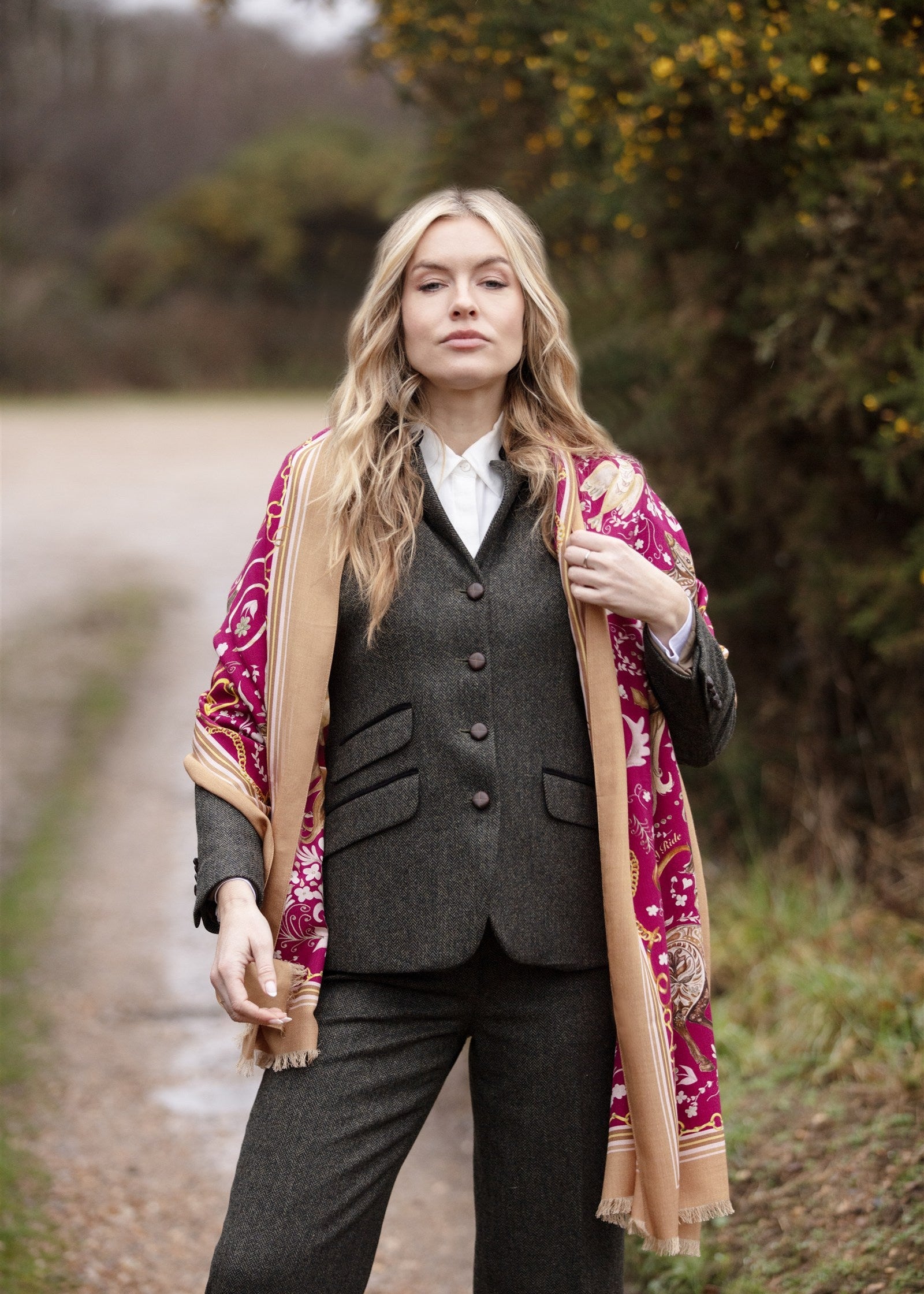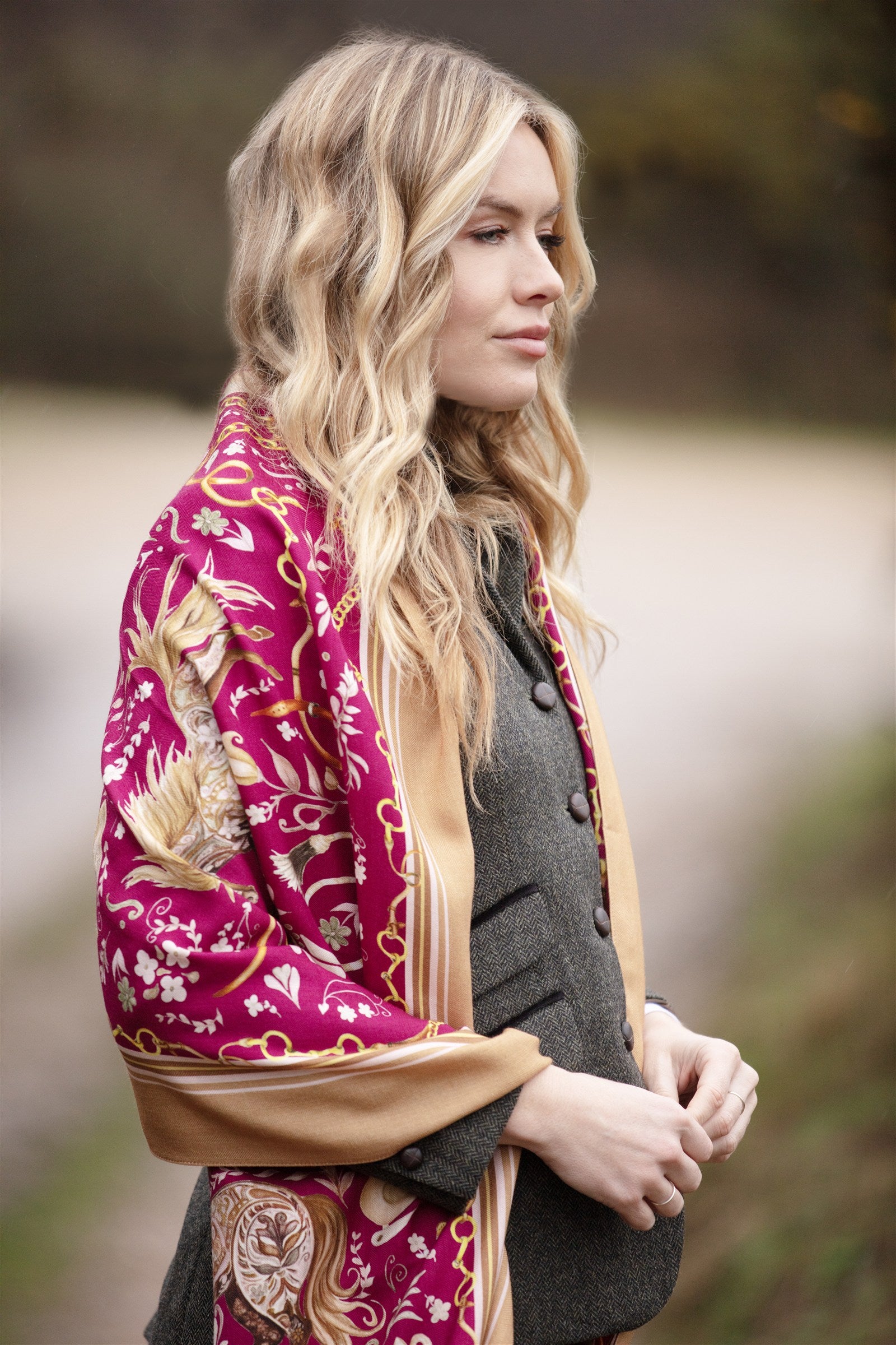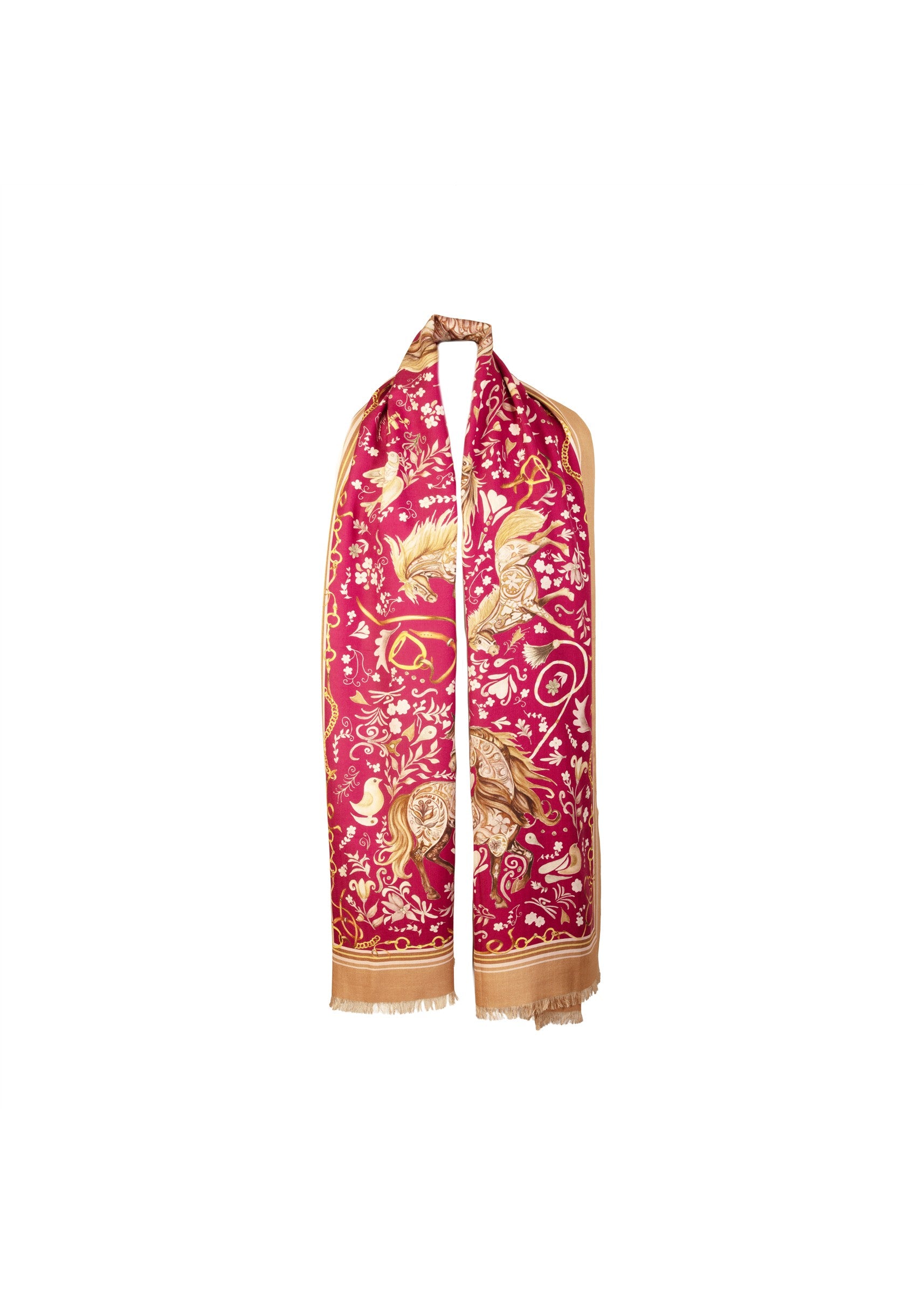 Wrap yourself in our generously sized Portobello Pink Wool Silk Wrap as we salute 2026, The Year of the Horse. The Wool Silk Wrap is one of our largest pieces, featuring a divine equestrian tableau which is easy on the eye and lustrous against the skin. The beautifully composed mix of wool and silk creates a divine fluidity and handle, guaranteeing you'll be effortlessly chic, from the stable yard to the Square Mile.