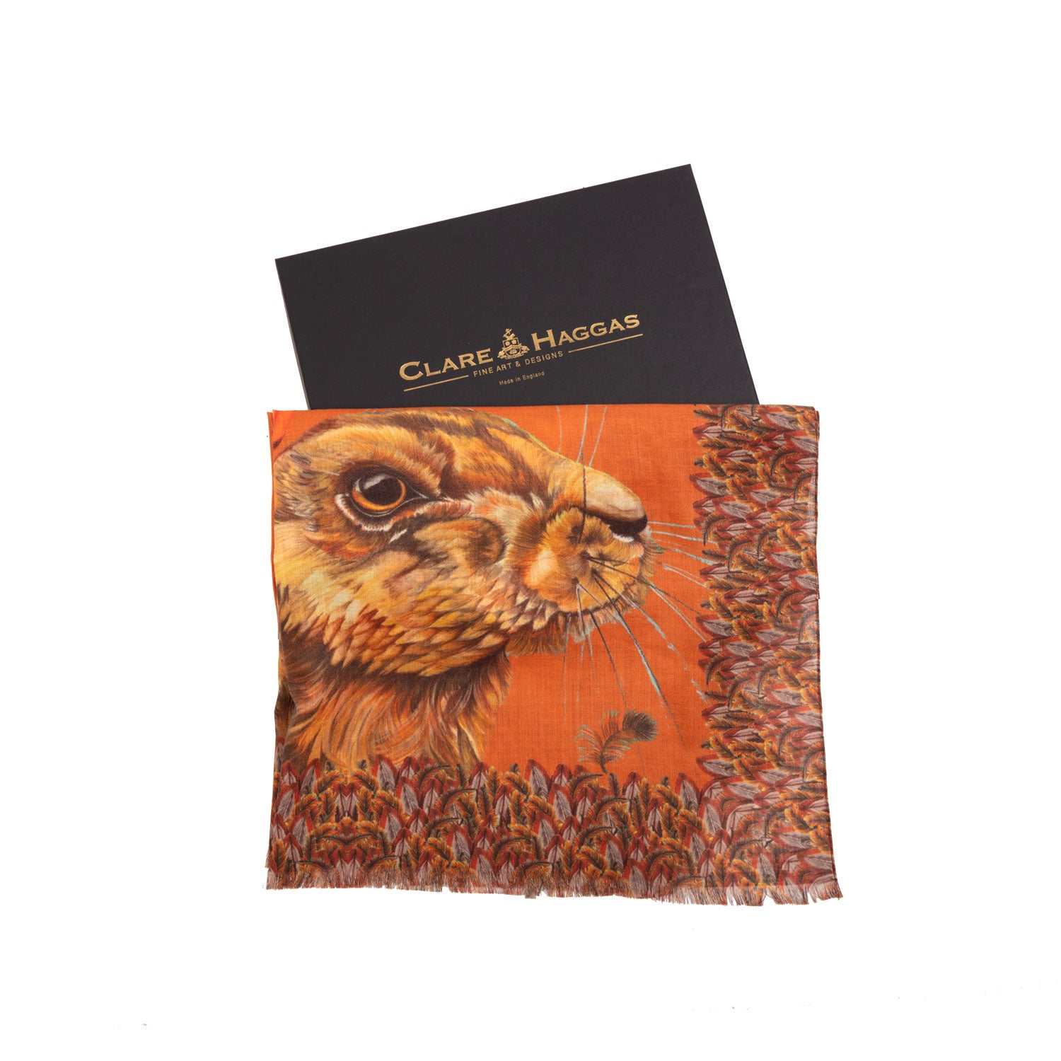 Crafted from a luxurious wool-silk blend, this piece takes features iconic personalities from Clare's original artworks. George the Pheasant and the beautiful hare drape down each side of the scarf, with the majestic “Caledonia” red stag sitting at the neck, joined by a handful of gamebirds and floating feathers adorning the rest of the wrap.