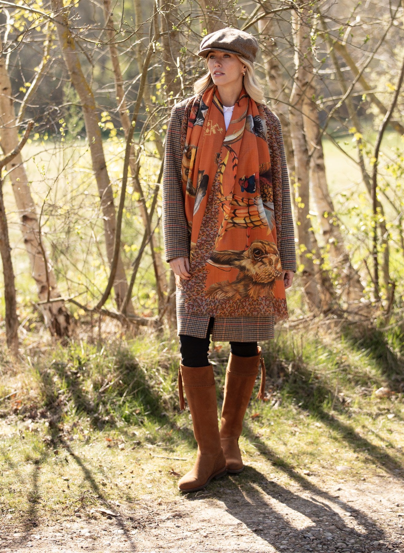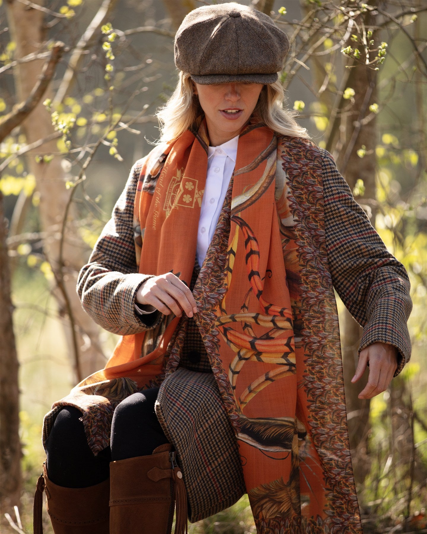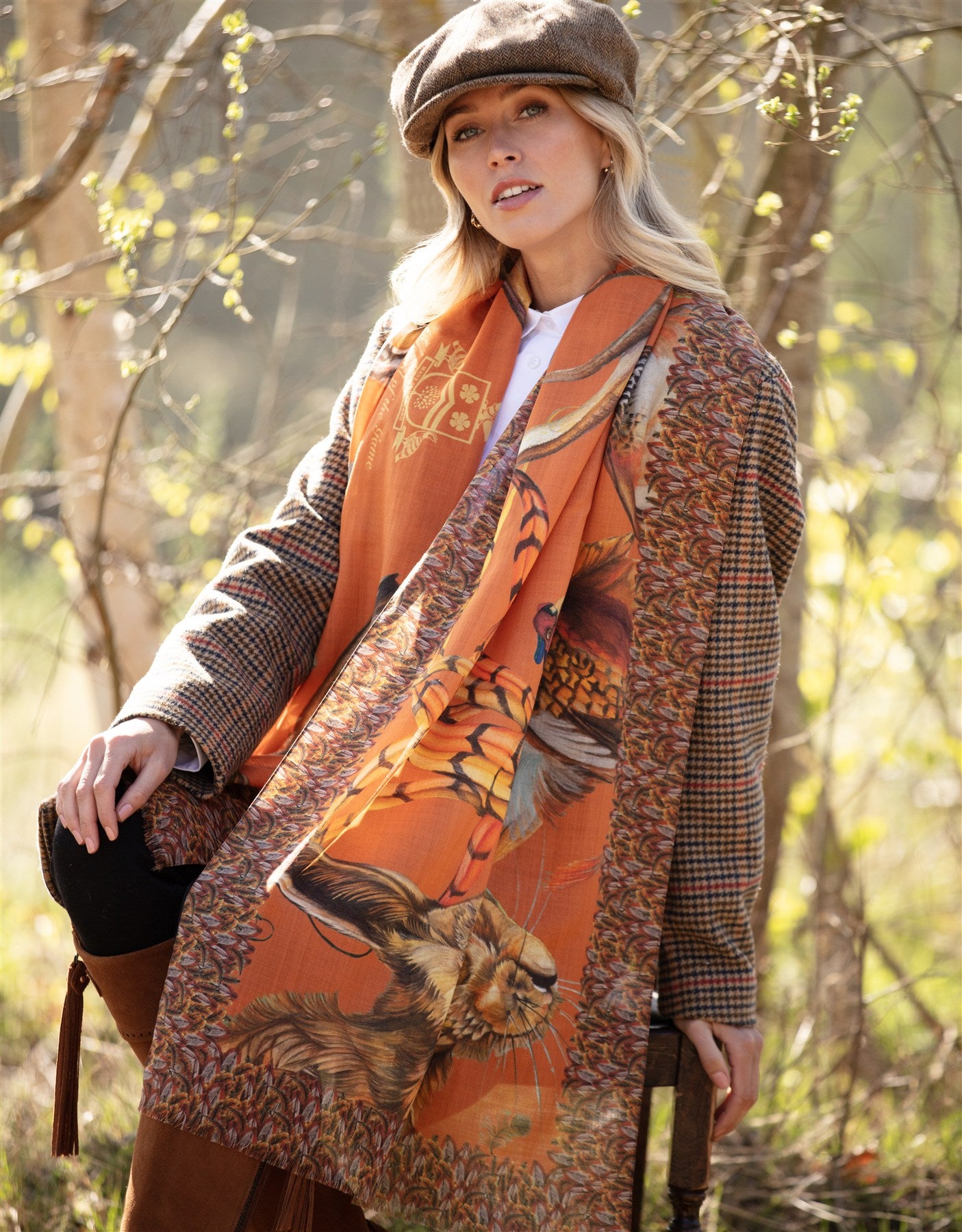 Pheasants, grey and French partridges, the majestic stag (“Caledonia”), hare, snipe, and feather accents all intermingle in this joyous collection. With a seasonal Burnt Orange colourway now available in our Wool Silk Wrap, there's no better way to immerse yourself in Autumnal hues.