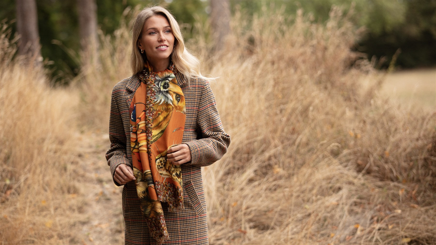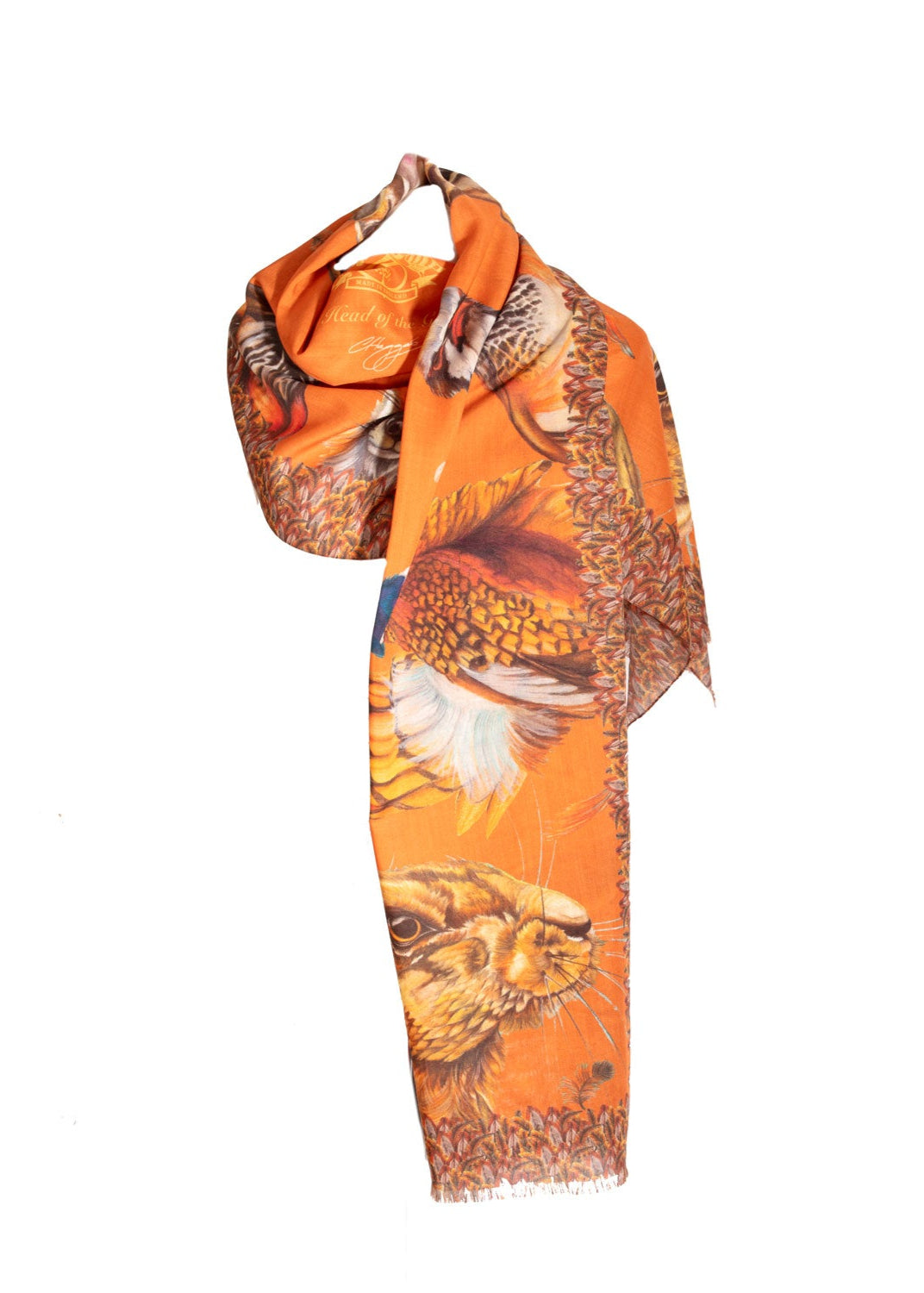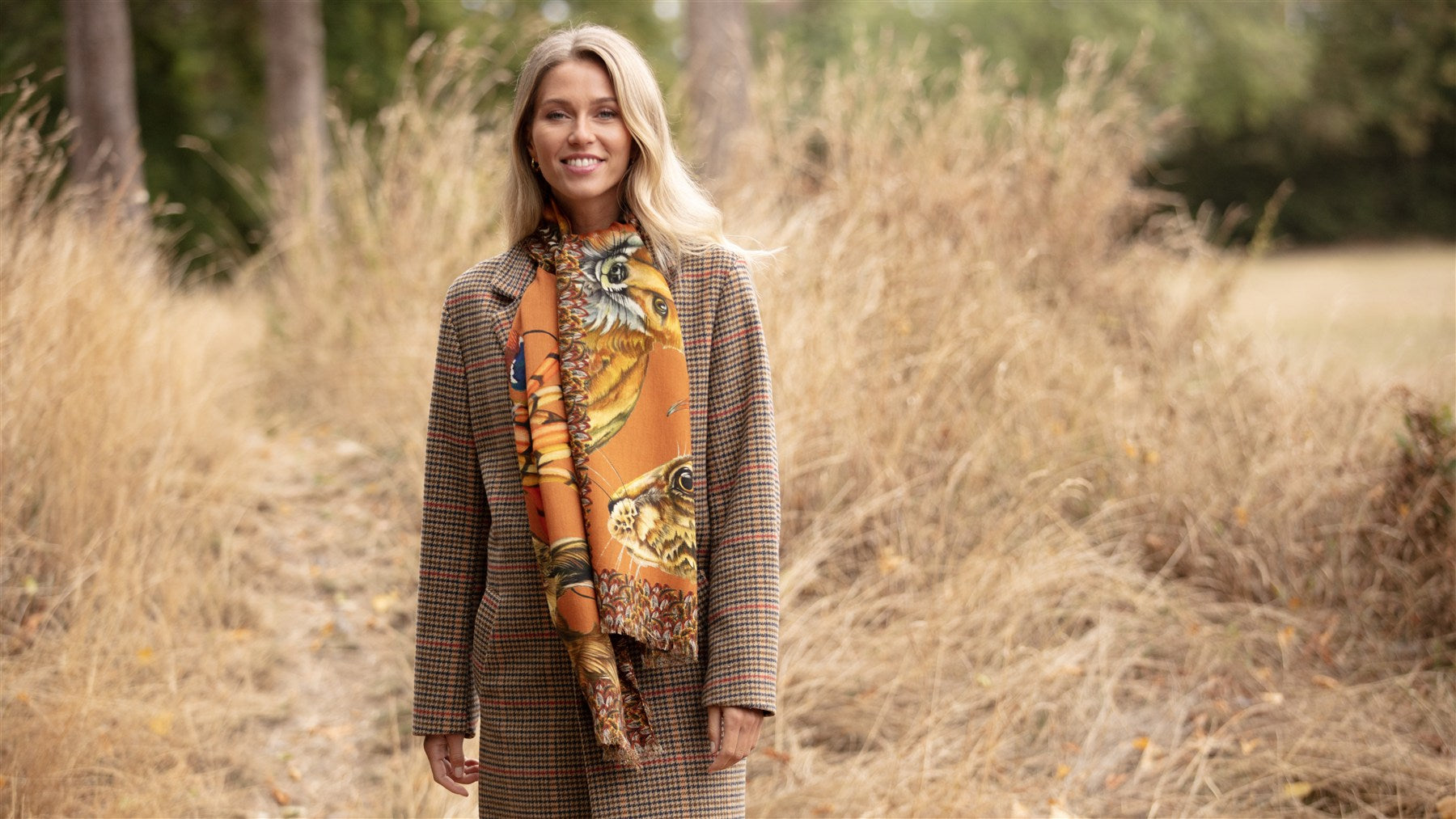 Pheasants, grey and French partridges, the majestic stag (“Caledonia”), hare, snipe, and feather accents all intermingle in this joyous collection. With a seasonal Burnt Orange colourway now available in our Wool Silk Wrap, there's no better way to immerse yourself in Autumnal hues.