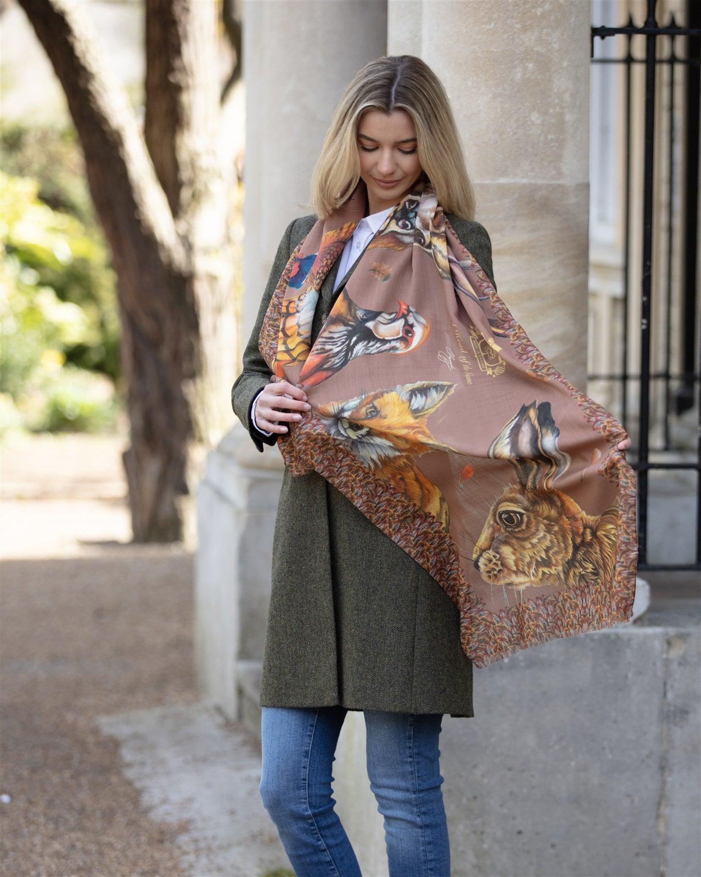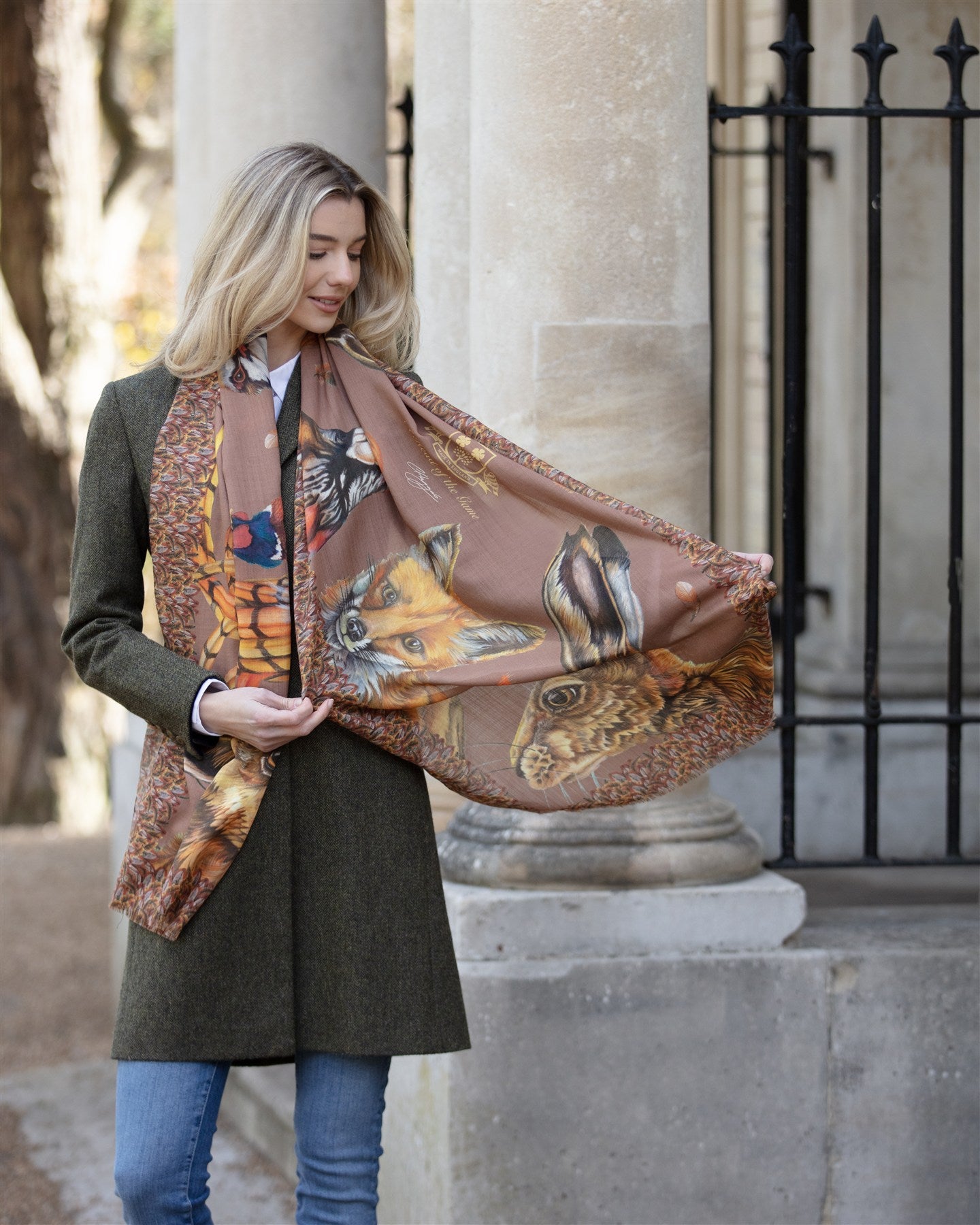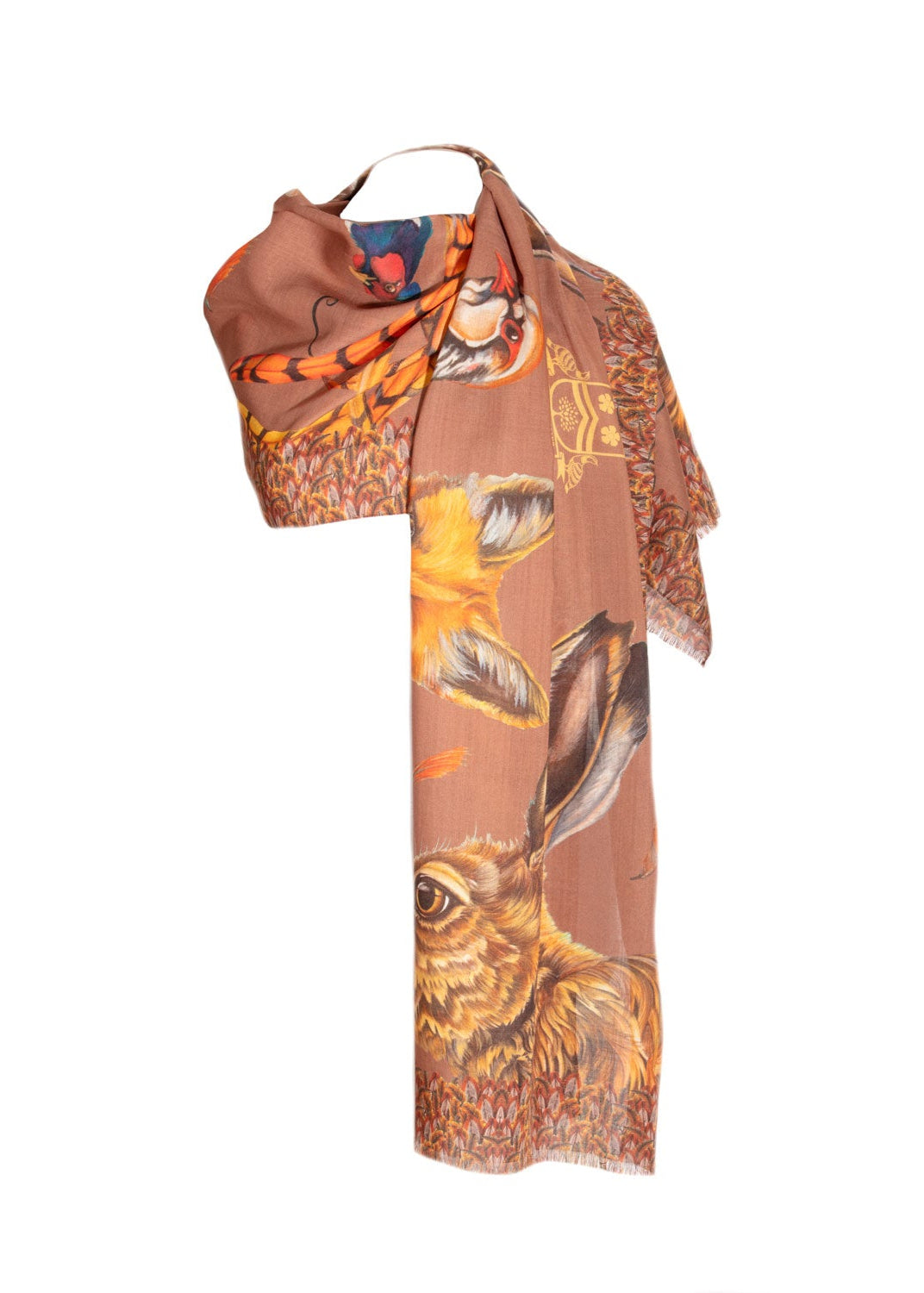 Crafted from a luxurious wool-silk blend, this piece takes features iconic personalities from Clare's original artworks. George the Pheasant and the beautiful hare drape down each side of the scarf, with the majestic “Caledonia” red stag sitting at the neck, joined by a handful of gamebirds and floating feathers adorning the rest of the wrap.