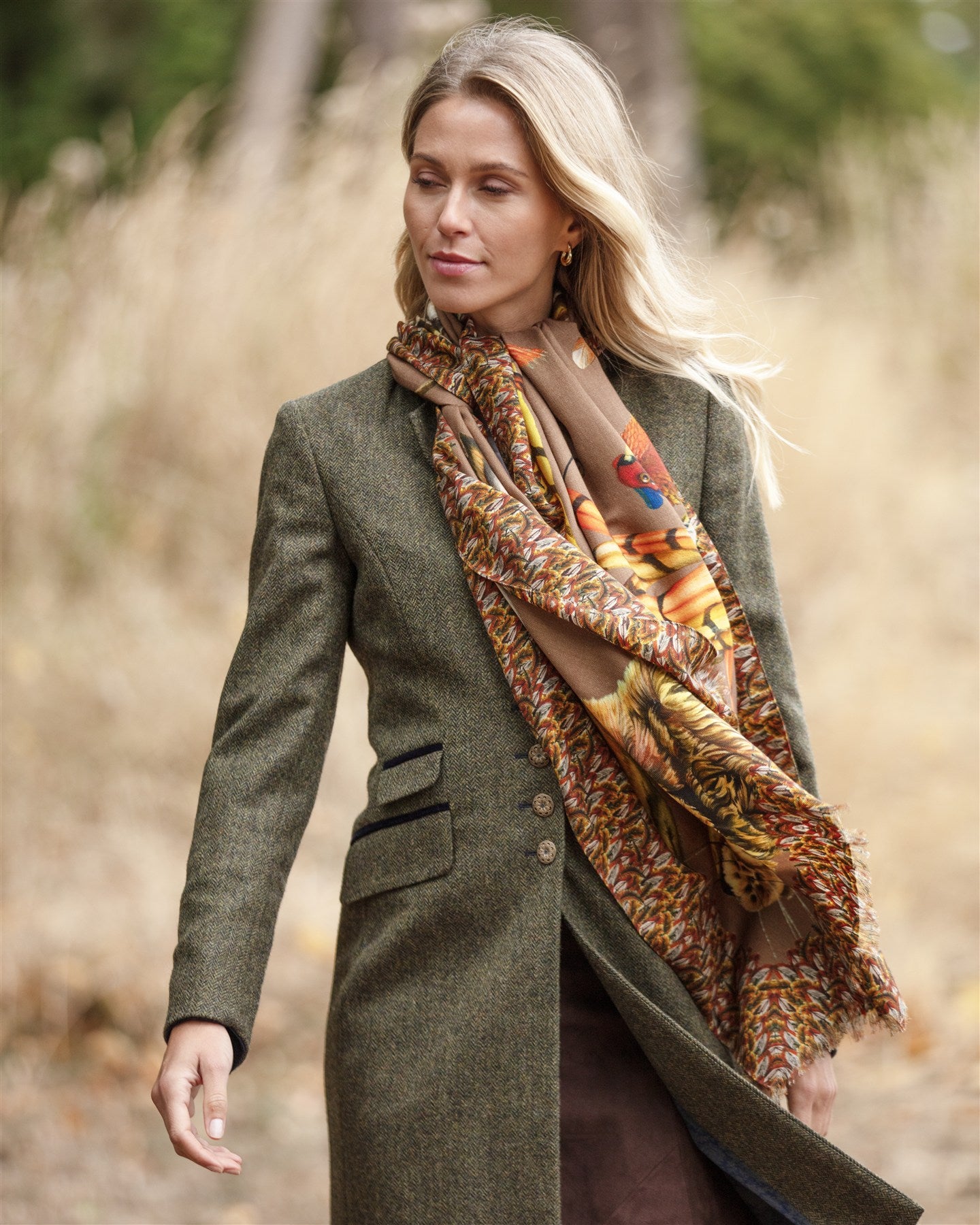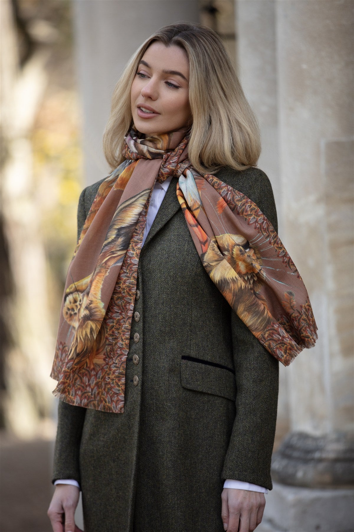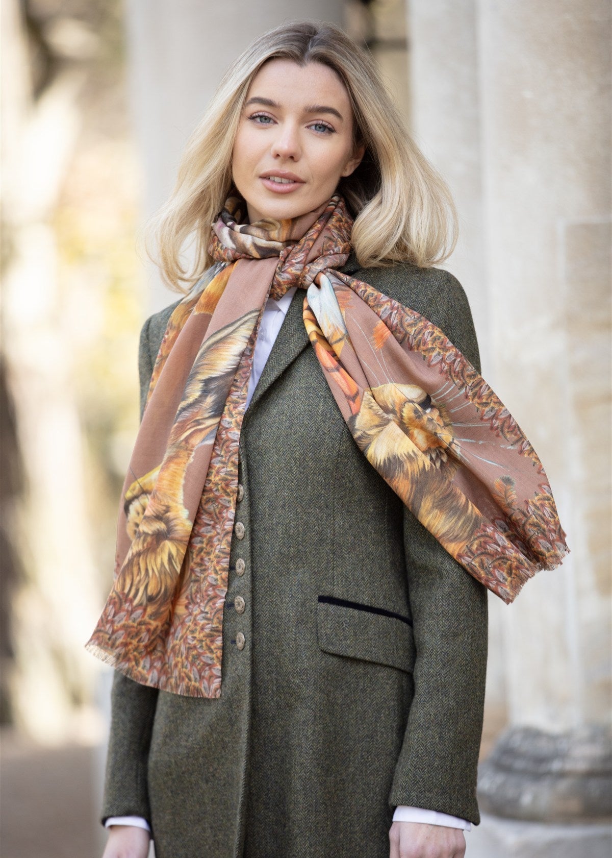 Crafted from a luxurious wool-silk blend, this piece takes features iconic personalities from Clare's original artworks. George the Pheasant and the beautiful hare drape down each side of the scarf, with the majestic “Caledonia” red stag sitting at the neck, joined by a handful of gamebirds and floating feathers adorning the rest of the wrap.