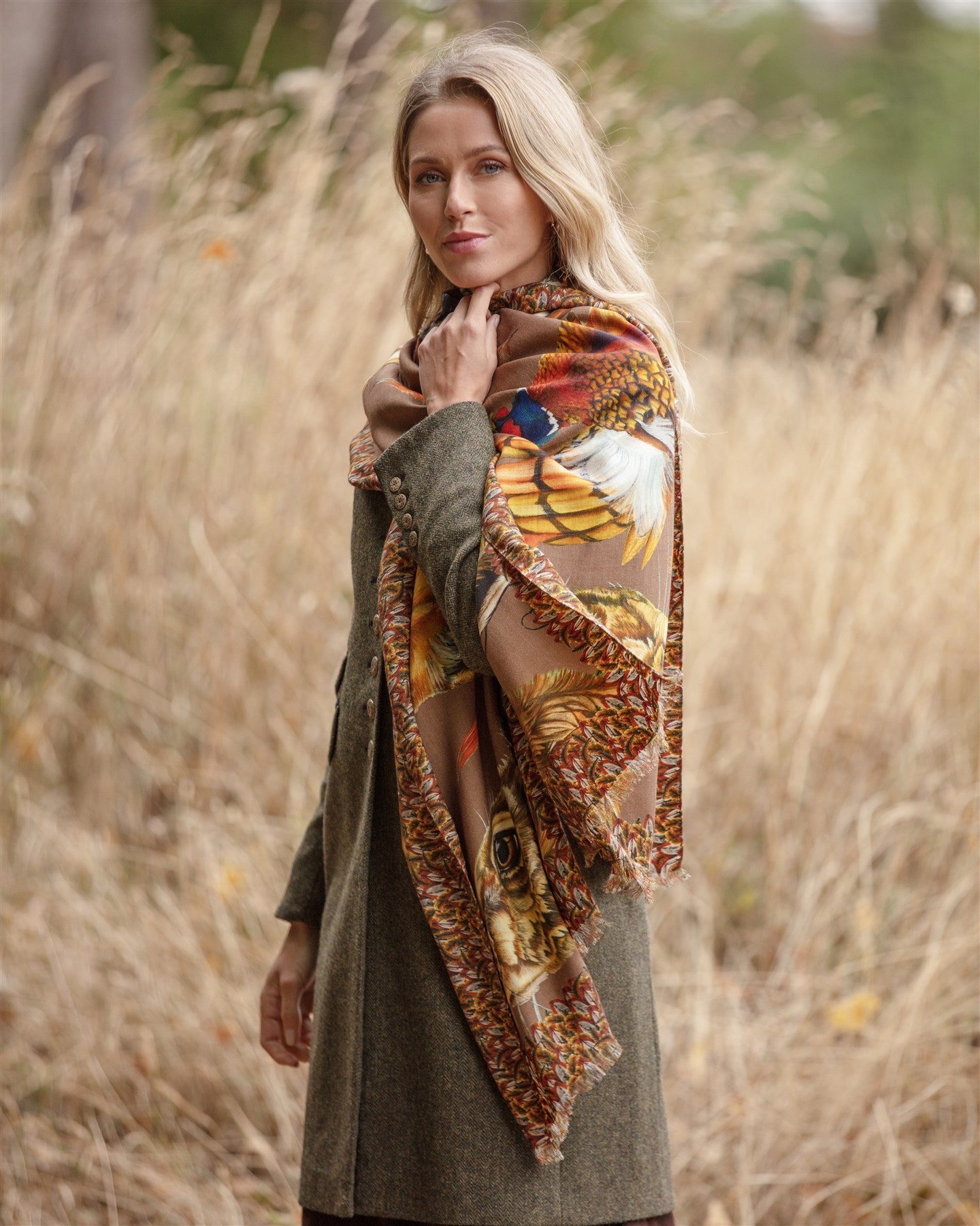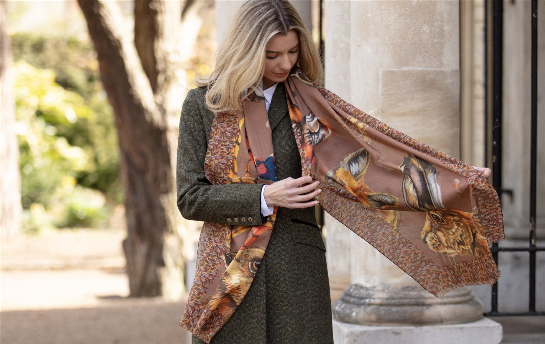 Pheasants, grey and French partridges, the majestic stag (“Caledonia”), hare, snipe, and feather accents all intermingle in this joyous collection. With a warming Mocha colourway now available in our Wool Silk Wrap, there's no better way to immerse yourself in Autumnal hues.