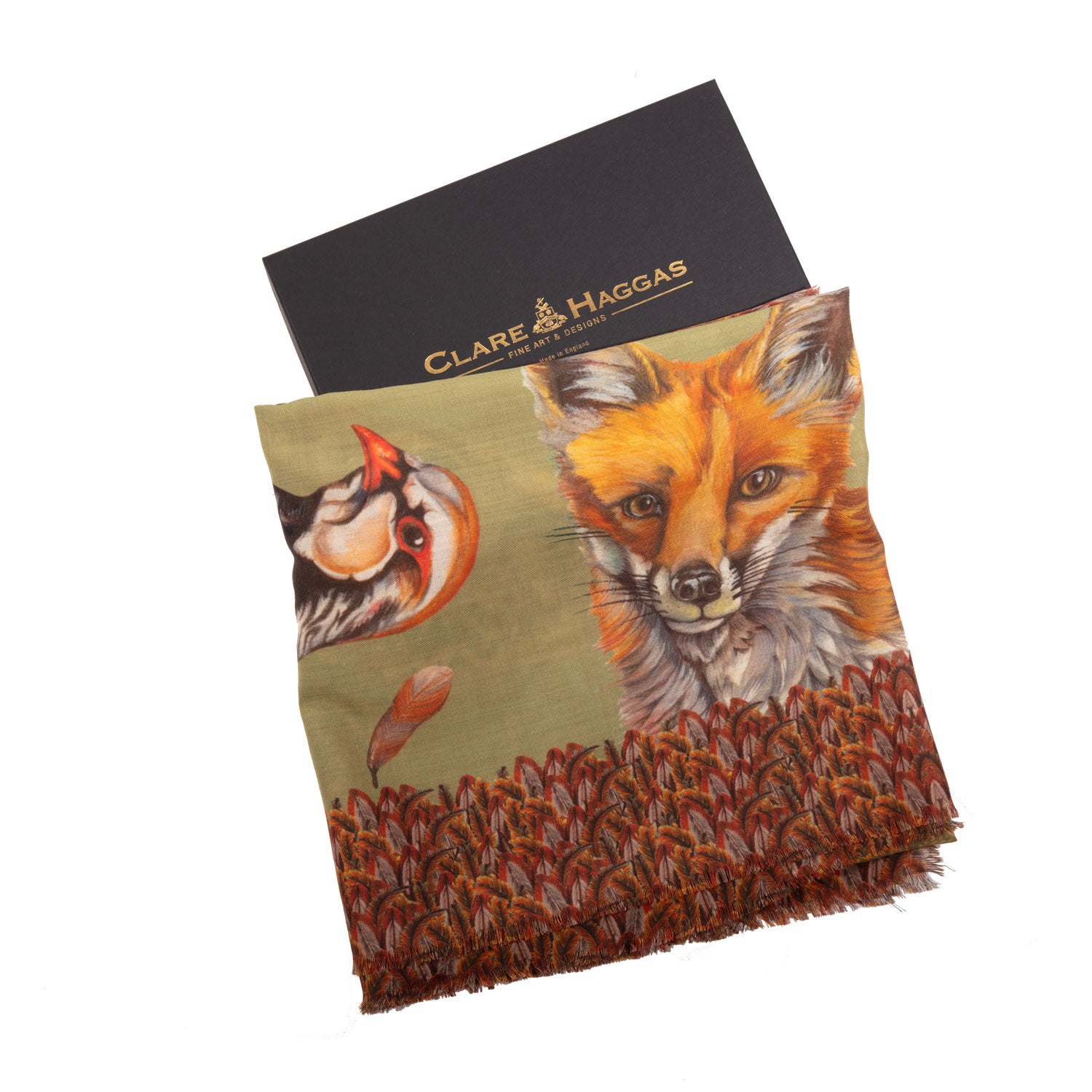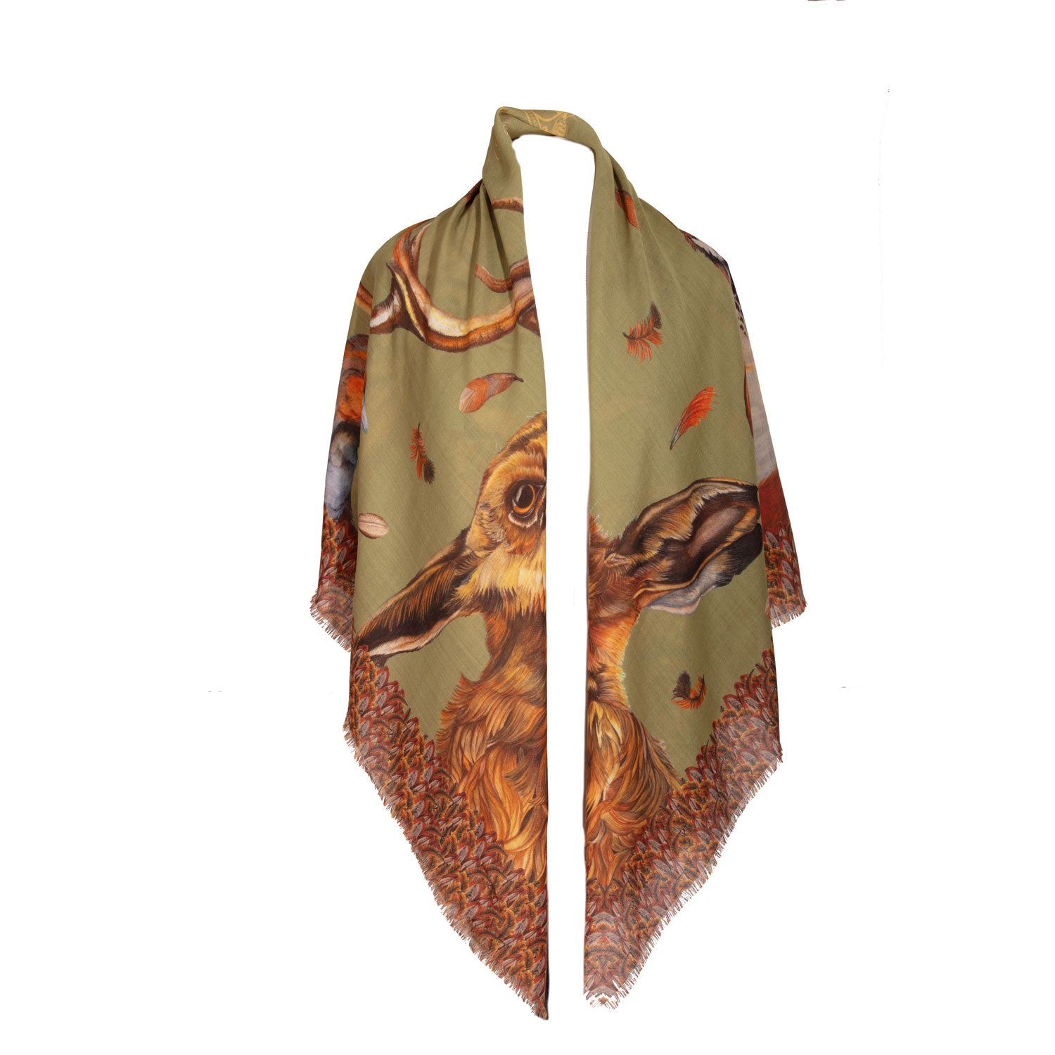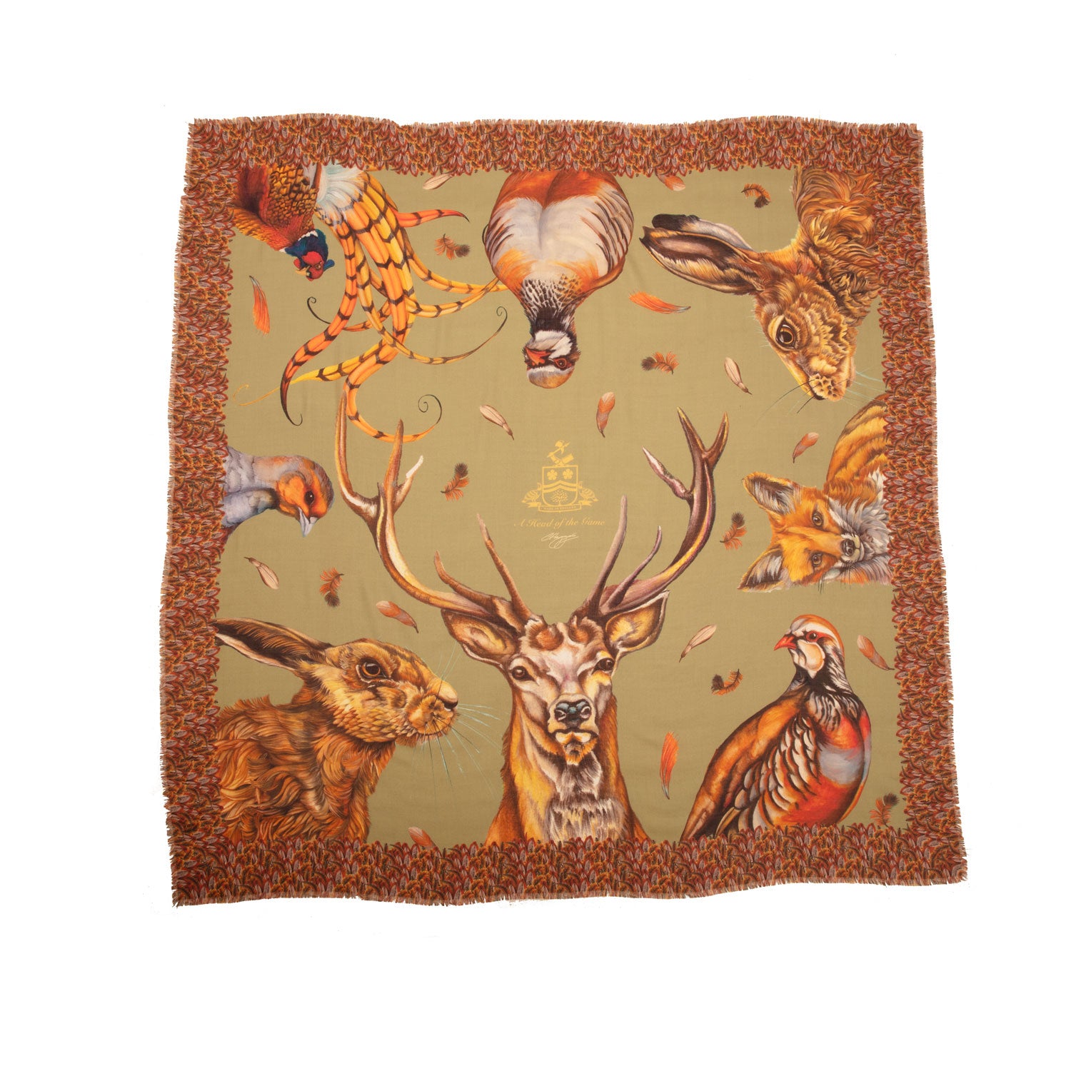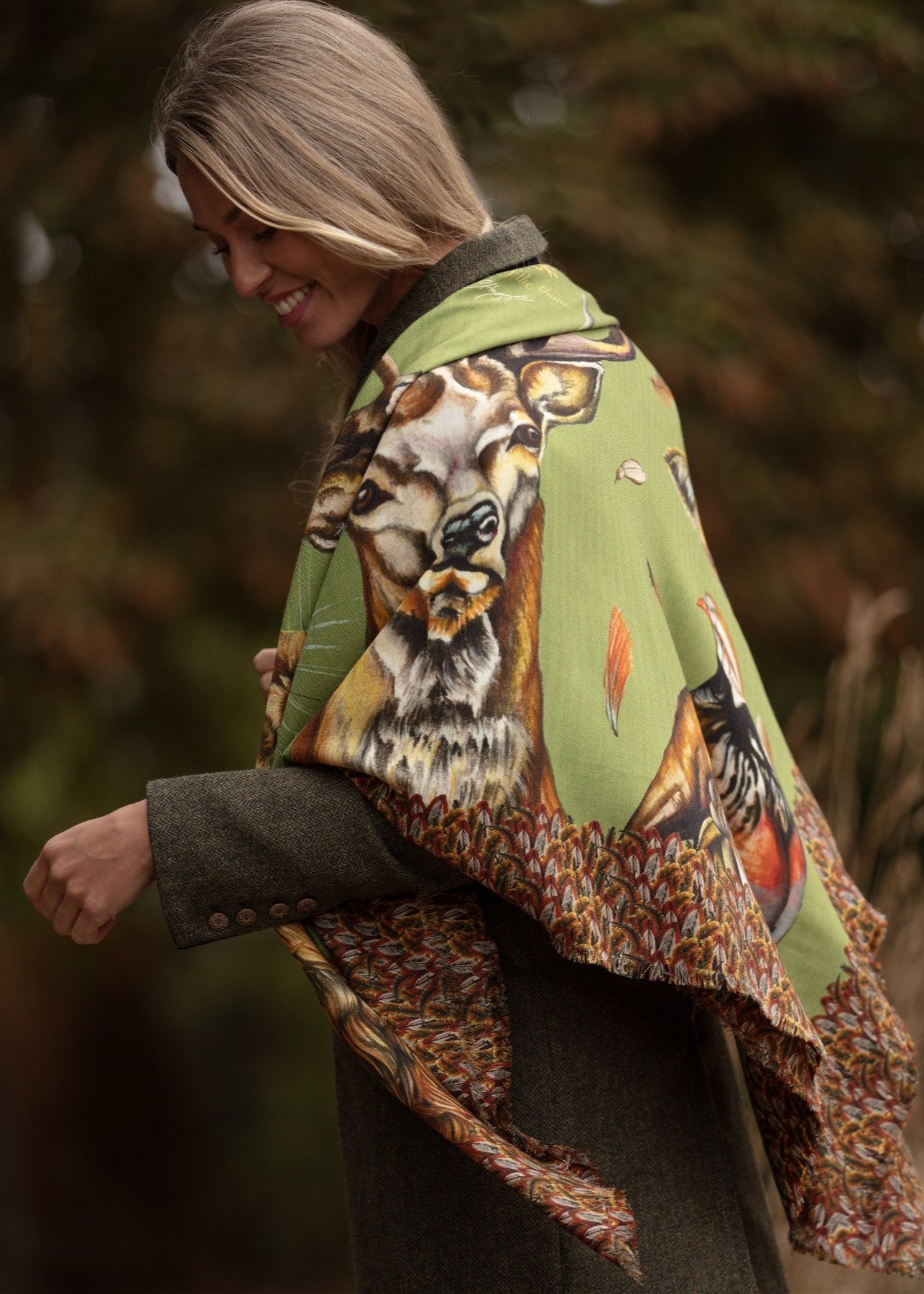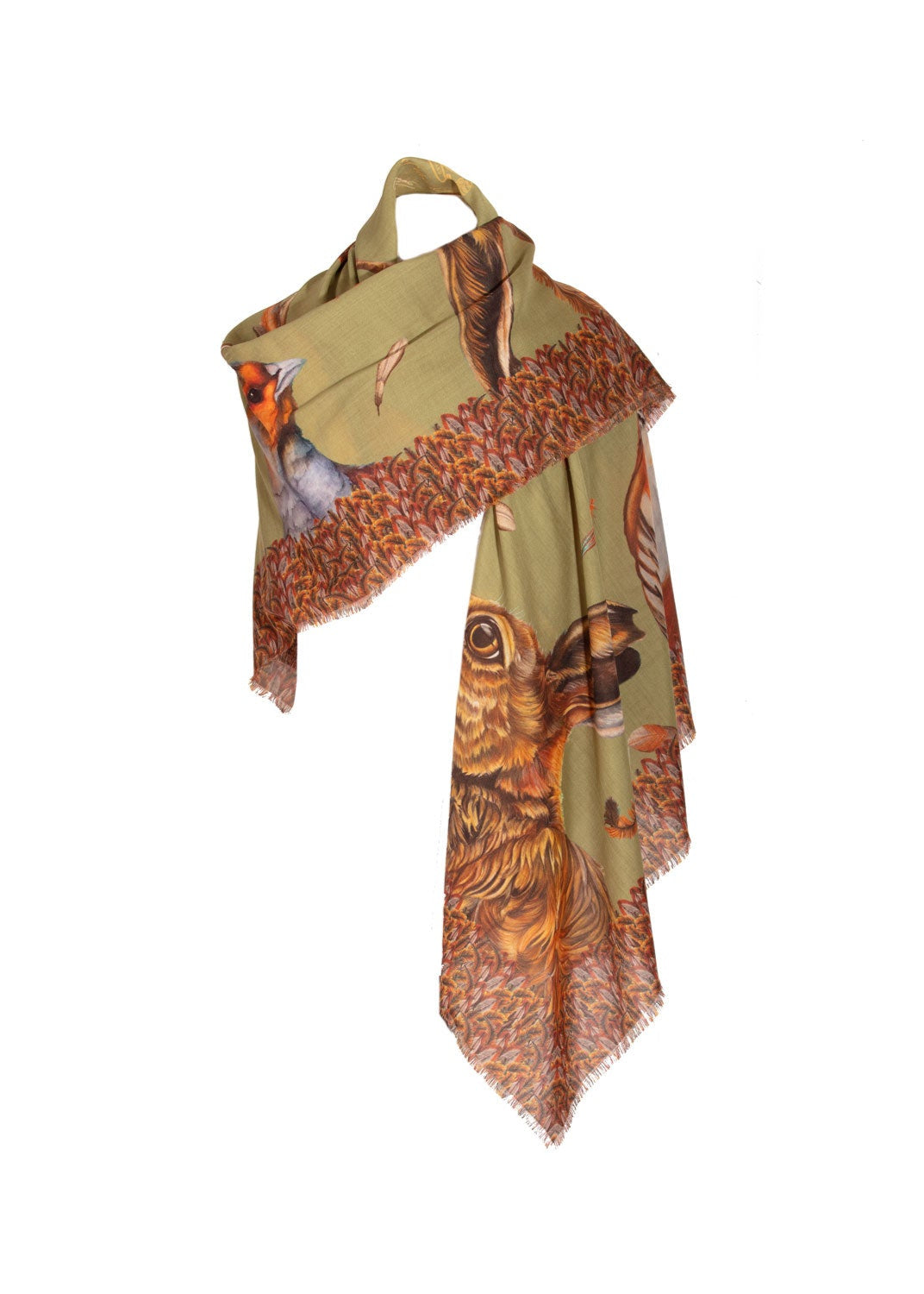 Crafted from a luxurious wool-silk blend, this piece takes features iconic personalities from Clare's original artworks. George the Pheasant and the beautiful hare drape down each side of the scarf, with the majestic “Caledonia” red stag sitting at the neck, joined by a handful of gamebirds and floating feathers adorning the rest of the shawl.
