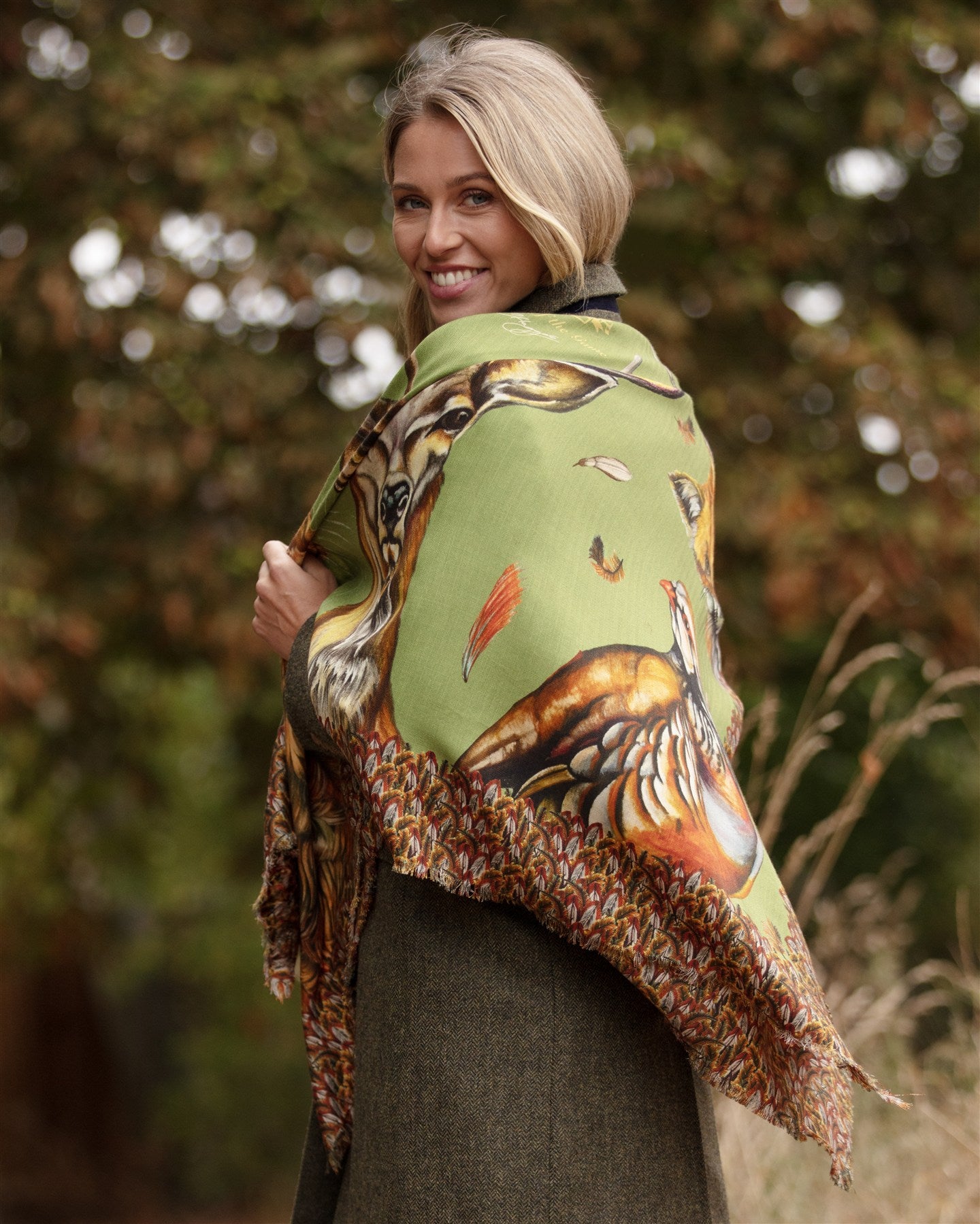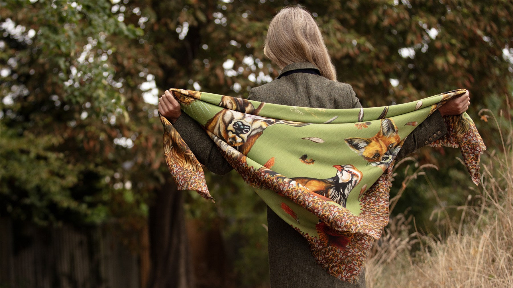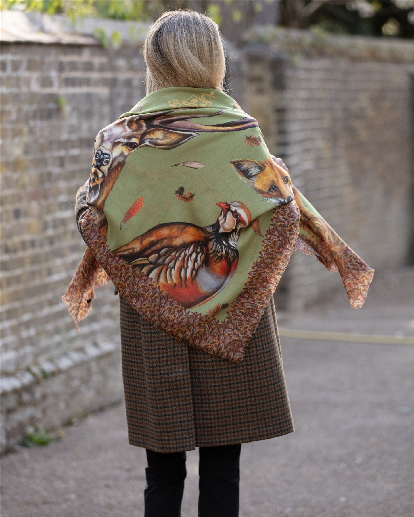 Pheasants, grey and French partridges, the majestic stag (“Caledonia”), hare, snipe, and feather accents all intermingle in this joyous collection. With an earthy Fern colourway now available in our Wool Silk Shawl, there's no better way to wrap yourself in Autumnal hues.