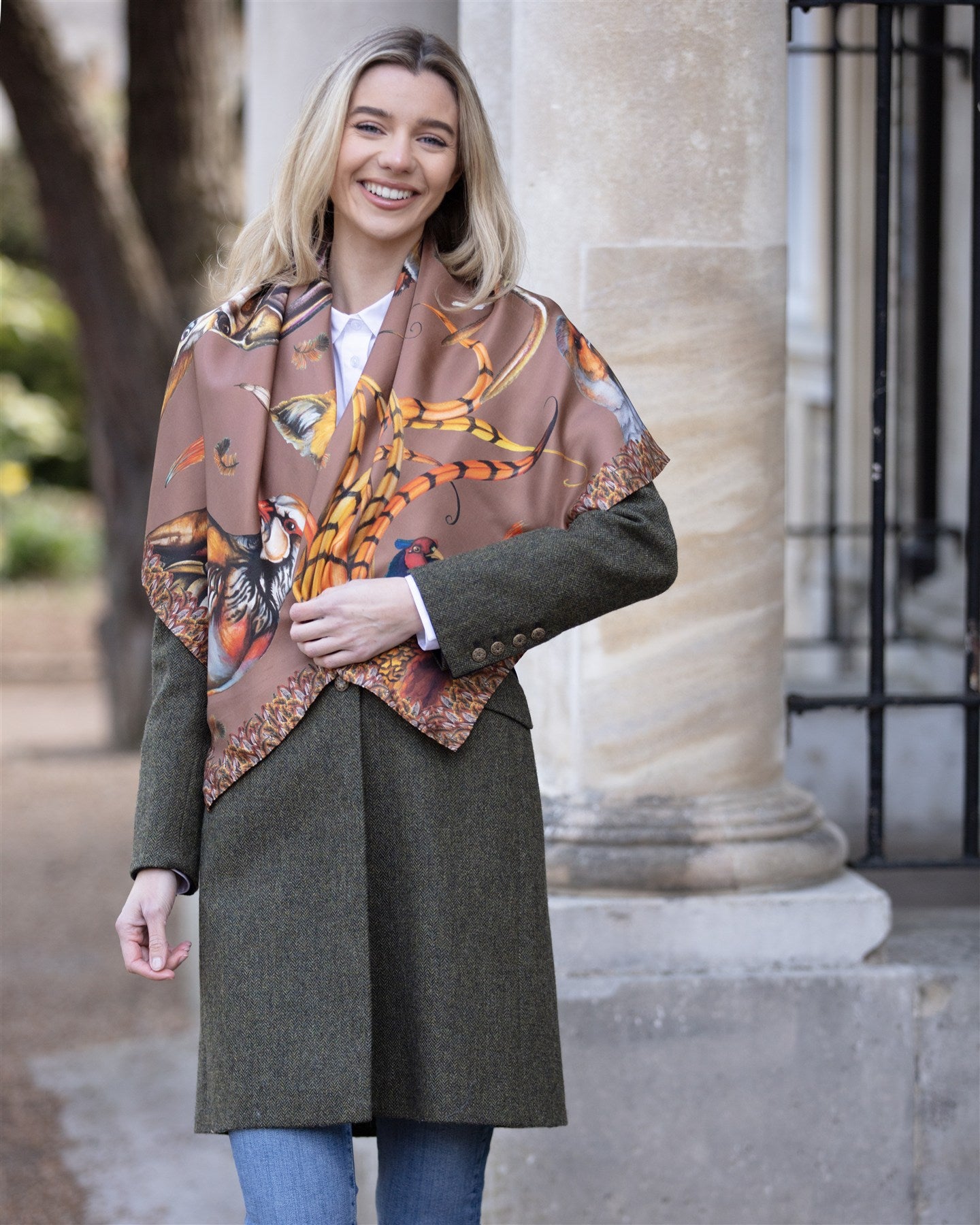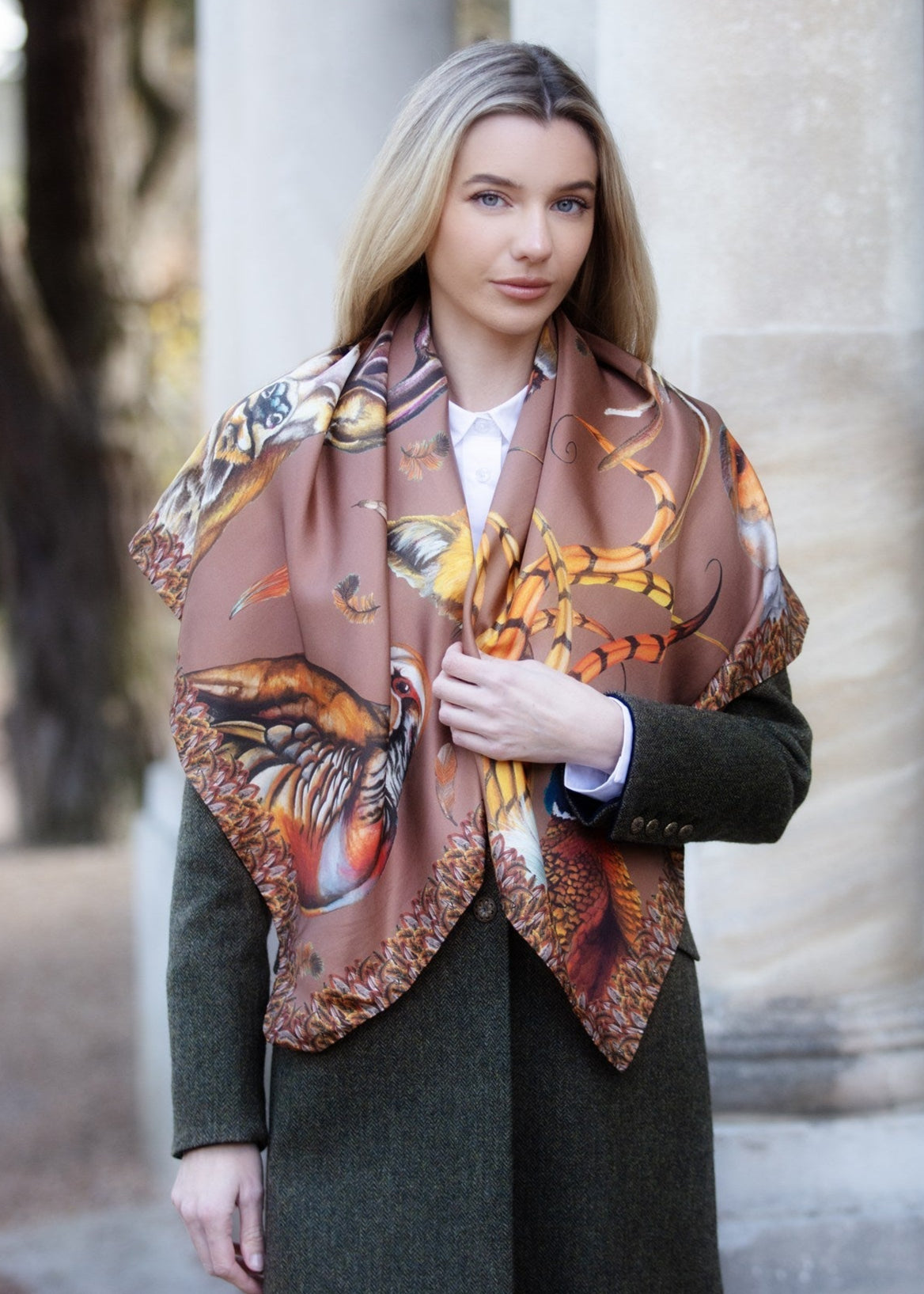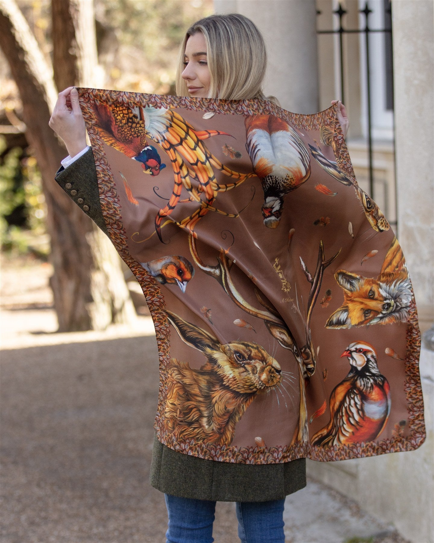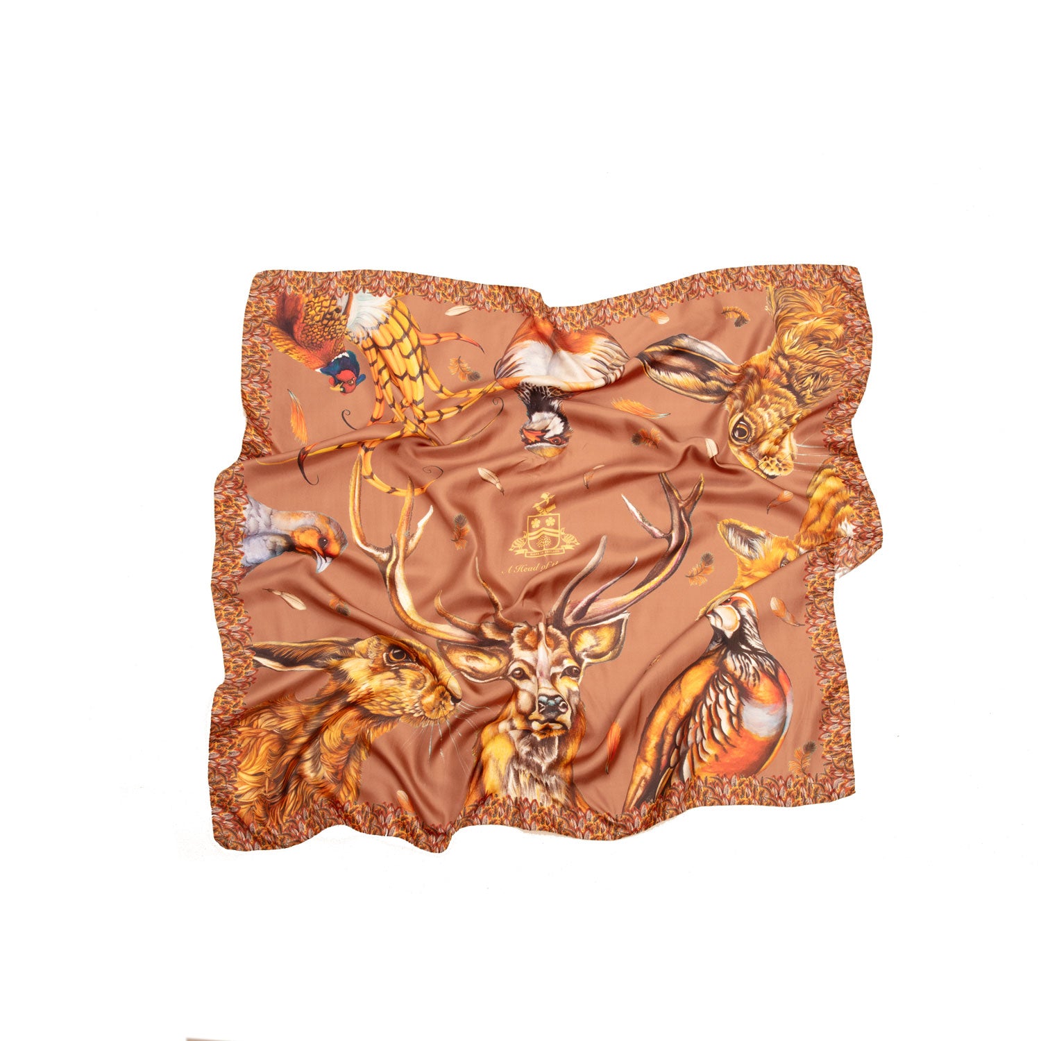 Pheasants, grey and French partridges, the majestic stag (“Caledonia”), hare, snipe, and feather accents all intermingle in this joyous collection. With a warming Mocha colourway now available in our luxurious Large Square Pure Silk Scarf, there's no better way to wrap yourself in Autumnal hues.