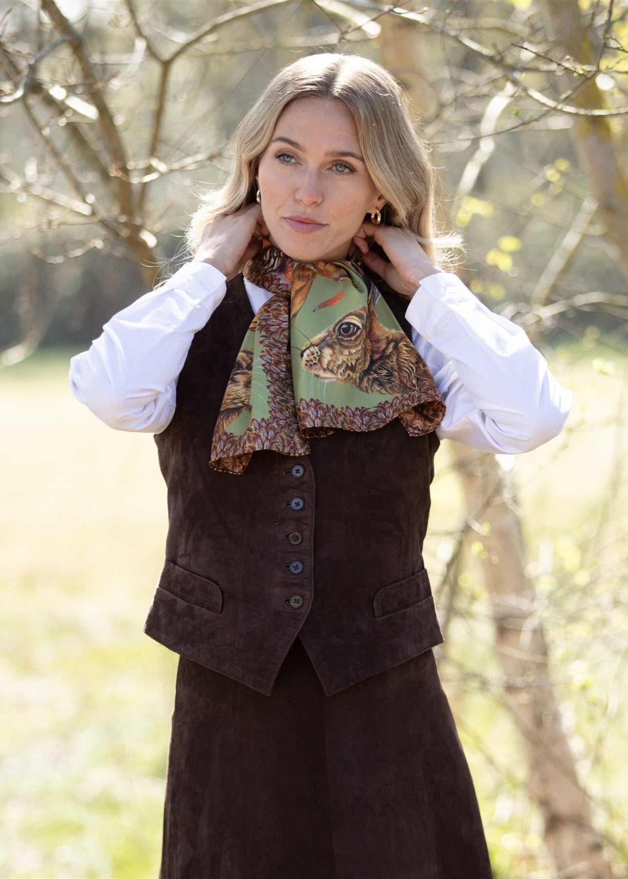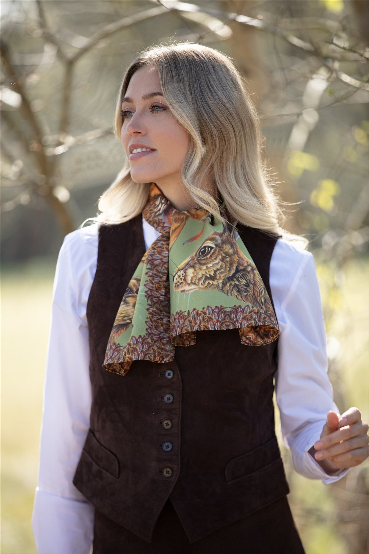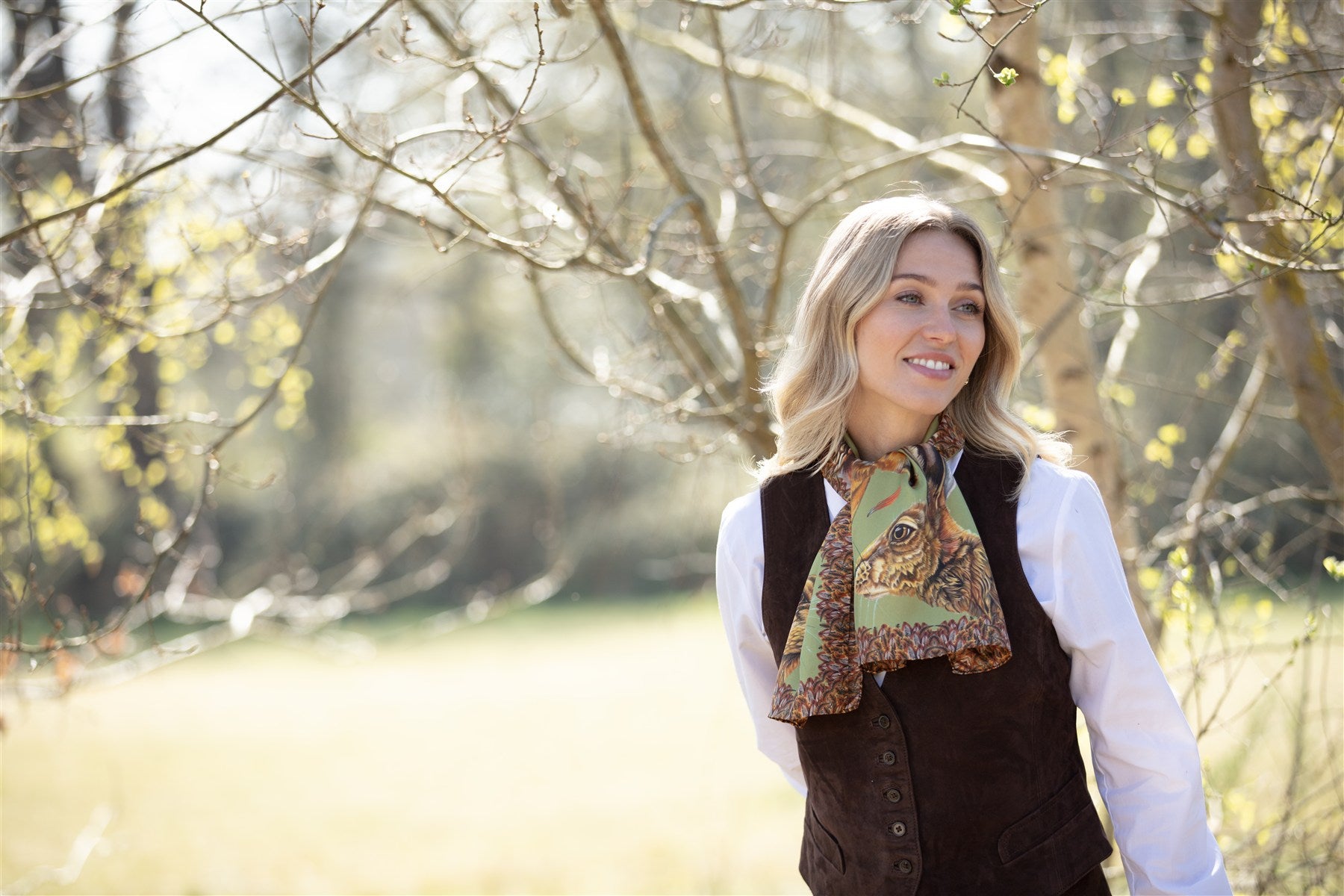 Pheasants, grey and French partridges, the majestic stag (“Caledonia”), hare, snipe, and feather accents all intermingle in this joyous collection. With an earthy Fern Green colourway now available in our Narrow Pure Silk Scarf, there's no better way to wrap yourself in Autumnal hues.
